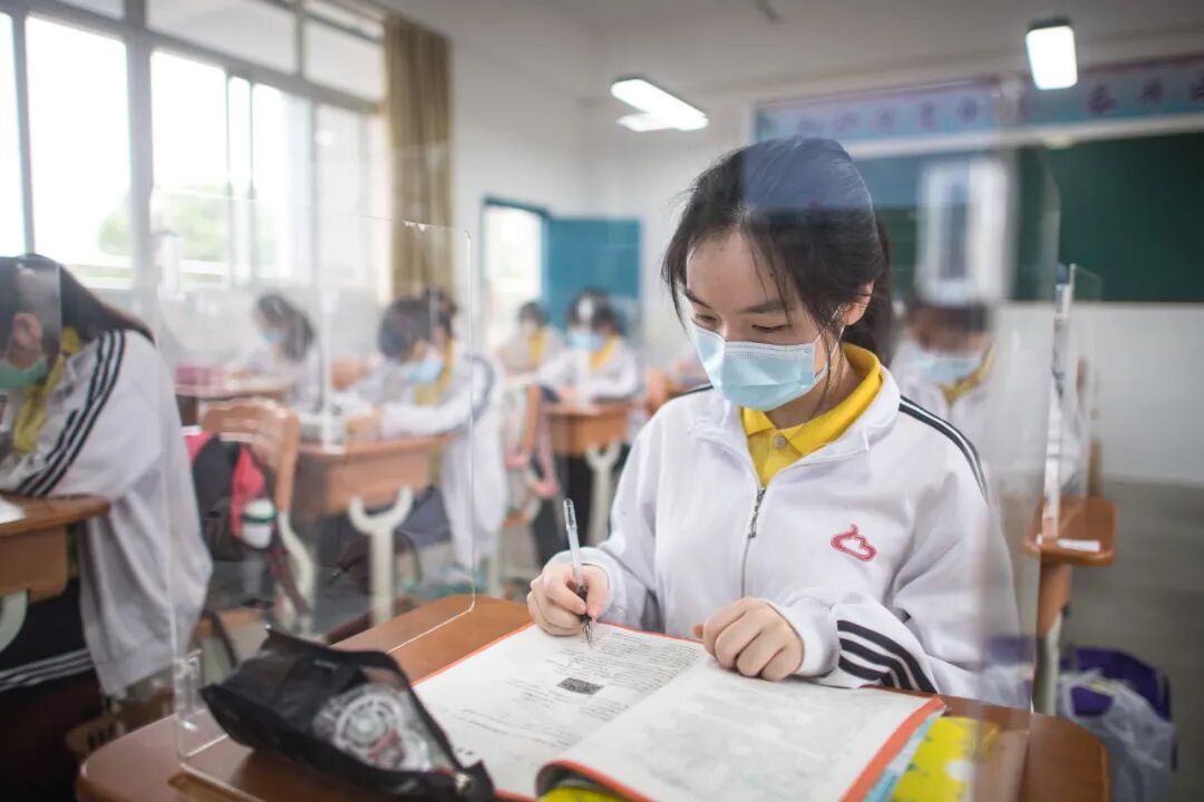 5月6日,武汉市第二十三中学的高三年级学生在教室自习。武汉市第二十三中学为高三年级的540名复学学生准备了透明隔板,以阻断交流、就餐时可能产生的飞沫,力保师生健康安全。 新华社记者 肖艺九 摄